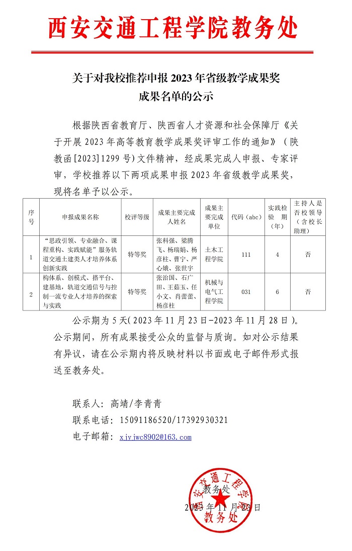 关于对我校推荐申报2023年省级教学成果奖成果名单的公示