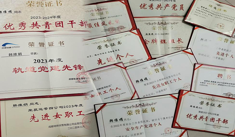 凭借着这份热忱和勤奋,韩维娟带领支部多次跻身考核前列,个人亦获评成都轨道集团巾帼建功标兵、轨道党建先锋、优秀共产党员、优秀共青团干部等多项荣誉称号,以实干诠释共产党员的使命担当。