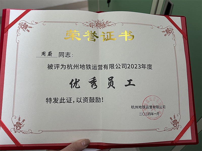 “司机的日常工作就是要时刻保持警惕,因为我们驾驶列车的第一要义就是安全。”周蔚深知,作为地铁司机,她不仅承担着运输任务,更肩负着保障乘客安全的重任。无论是面对复杂的交通状况,还是应对突发的紧急情况,她都能迅速做出判断,采取有效措施,确保行车安全。周蔚在2022年和2023年连续两年荣获杭州地铁运营有限公司优秀员工。荣誉背后,是她无数个日夜的坚守与努力,是她对每一个细节精益求精的执着追求。