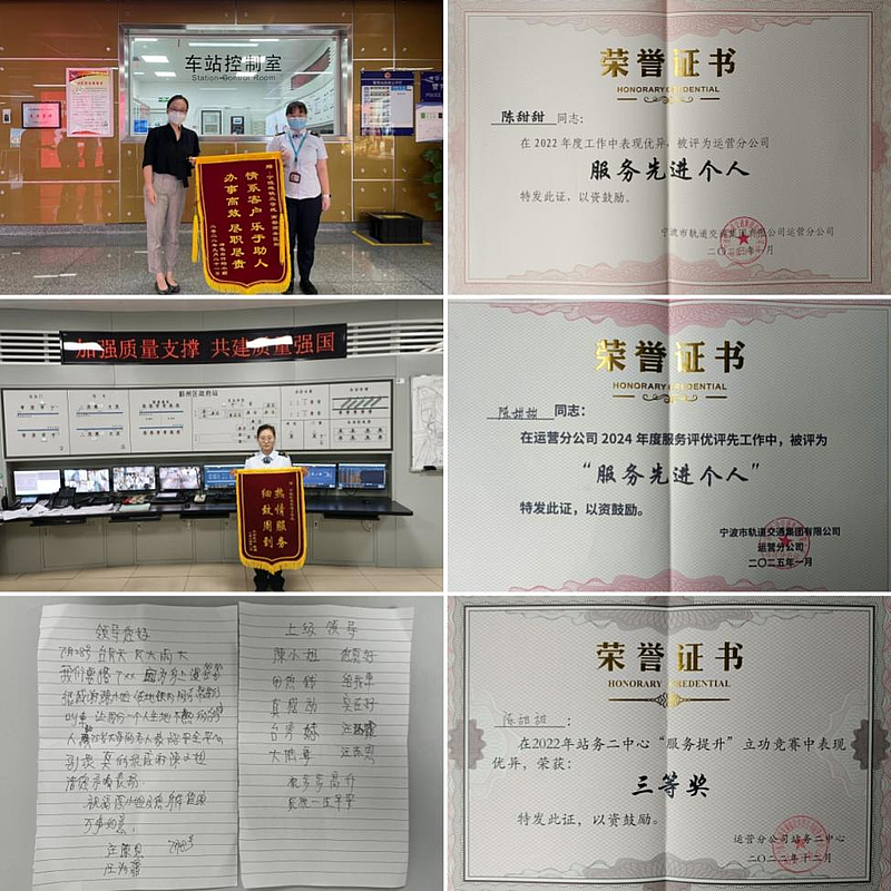 在提升乘客体验方面,针对候车场景痛点,陈甜甜创新推出“温馨候车区”,增设舒适座椅垫、迷你书架及便民宣传册,将冰冷的站台转化为充满人文关怀的“城市客厅”。从救助低血糖乘客,到护送轮椅乘客进出站;从帮助探亲同胞顺利出行,到为乘客找回遗失物品,她用一件件暖心服务事迹,擦亮轨道交通服务品牌。凭借卓越表现,她先后荣获“服务先进个人”、服务提升立功竞赛三等奖、站务二中心票务技术比武第三名等荣誉。