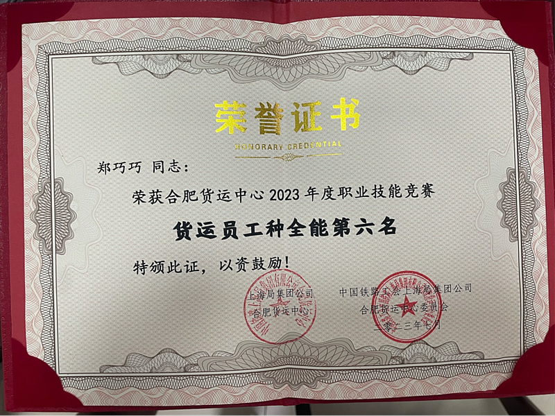 工作中,郑巧巧始终以党员标准严格要求自己,先后斩获多项荣誉:2023年获评合肥物流中心“优秀共产党员”,同年于职业技能竞赛货运员工种全能赛中荣获第六名;2022至2024年连续三年获评“三星职工”,成为青年职工中的标杆。尤其在2022年上海疫情期间,她主动请缨驻守上海集中受理中心,连续奋战一线,保障铁路货运“大动脉”畅通无阻,为防疫物资运输和产业链稳定作出重要贡献。这段特殊经历让她深刻领悟到,铁路人的价值,在于成为连接生命与希望的纽带。