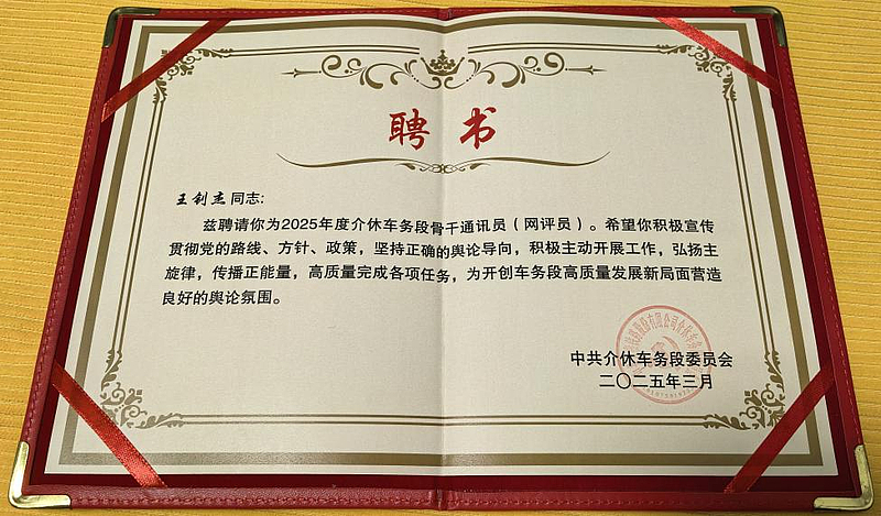 除了行车岗位上的过硬本领,王钊杰还拥有一双发现美的眼睛和一支传递温度的笔。2024年,凭借出色的文字功底和对一线工作的敏锐观察,他被聘为介休车务段骨干通讯员,成为铁路故事的记录者与传播者。