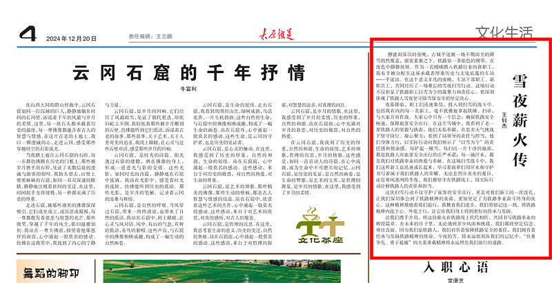 工作之余,他总是带着相机和笔记本穿梭在车站的各个角落。雪夜里坚守岗位的调度员、烈日下检修线路的工人、师徒间薪火相传的技艺切磋,这些平凡却动人的瞬间,都被他定格成文字。他撰写的《雪夜薪火传》一文,以细腻的笔触描绘了铁路人在极端天气下保障运输畅通的坚守,文章发表于《太原铁道》,让更多人读懂了铁路人的责任与担当。
